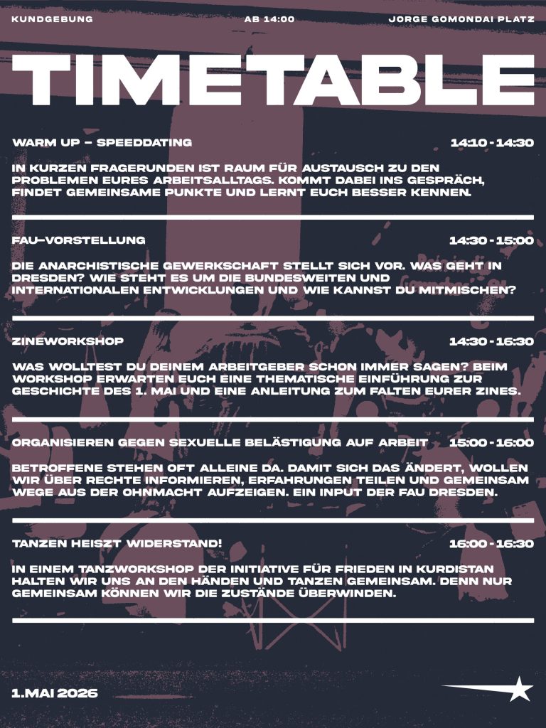 Arbeit, Arbeit, Arbeit?Wir wollen mehr vom Leben! Auch dieses Jahr wollen wir uns mit euch gemeinsam die Straße nehmen, um am traditionellen Arbeiter*innenkampftag unsere anarchistischen Überzeugungen stark zu machen. Dieser Tag steht für erkämpfte Rechte der Arbeiter*innen, die aktuell wieder massiv angegriffen werden. Was Bundeswirtschaftsministerin Reiche eine „Rückbesinnung auf mehr wirtschaftliche Freiheit und Eigenverantwortung“ nennt,… Anarchistischer 1. Mai 2026 weiterlesen - Rückblick Bewegungswochenende Anarchie & Tierbefreiung