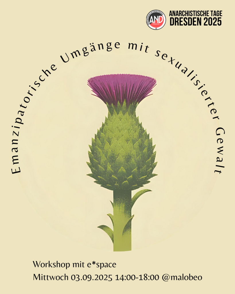 Was verstehen wir eigentlich unter sexualisierter Gewalt? Was sind Warnzeichen und Vorstufen davon und wie unterschiedlich können Reaktionen und Umgänge damit aussehen? Was kann ich tun wenn ich sexualisierte Gewalt in meinem Umfeld erlebe – wie können Reaktionen aussehen, was kann Betroffenen helfen? Und wie können Ansätze von Community Accountability dabei unterstützen? Mit dem Workshop wollen wir unsere Handlungsfähigkeit stärken, indem wir unterschiedliche Konzepte, Techniken und Strategien zum Umgang mit sexualisierter Gewalt besprechen.