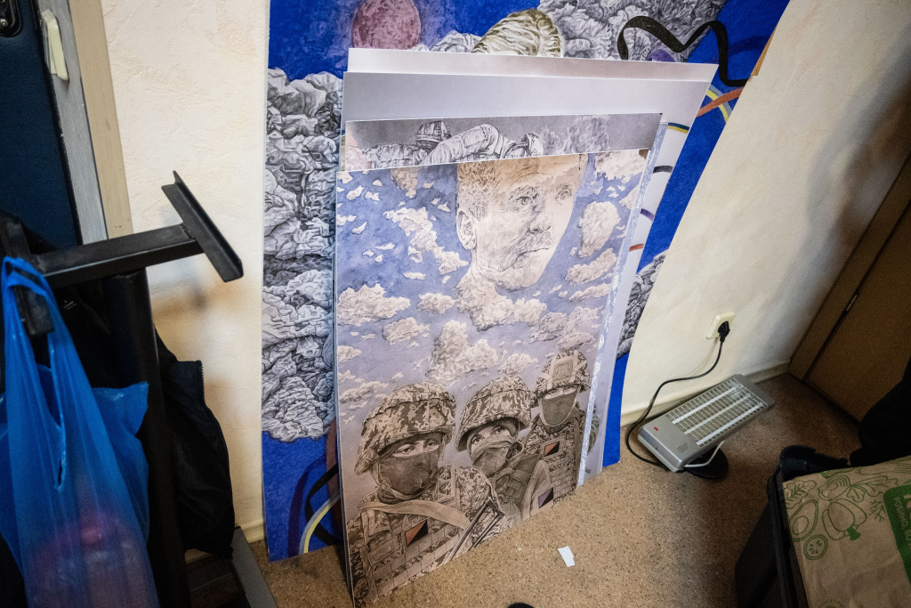 Am Nachmittag treffen wir Aktivist*innen von verschiedenen Gruppen im Büro von Solidarity Collectives. Über unseren Köpfen hängen eine anarcha-feministische und eine antifaschistische Flagge; auf einem Regal steht ein gemaltes Porträt des russischen Anarchisten Dmitri Petrow, der im Zuge der Kämpfe gegen den russischen Imperialismus 2023 in Bachmut gestorben ist; in einer Ecke stehen mehrere Zeichnungen des ukrainischen anarchistischen Künstlers David Chichkan, der dieses Jahr an der Front umgekommen ist. Eins zeigt drei Soldat*innen mit kleinen anarcha-feministischen und anarcho-syndikalistischen Abzeichen an den Uniformen. Hinter ihnen ein blauer Himmel mit weißen Wolken und darin ein blasses Porträt von Nestor Machno, als würde dort die Inspiration für die derzeitigen Kämpfe aufscheinen.