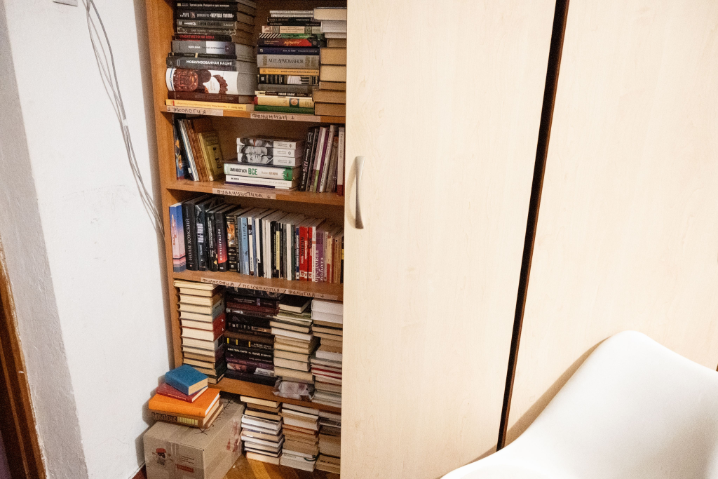 An diesem Abend treffen wir Kateryna, die eine anarchistische Bibliothek betreibt, die im Moment ausschließlich online existiert. Sie hat uns in ihre ehemalige Wohnung eingeladen, wo die Bücher momentan gelagert werden. Leben kann sie hier nicht mehr, weil das Viertel permanent bombardiert wird. „Das ist einfach zu stressig“, sagte sie.