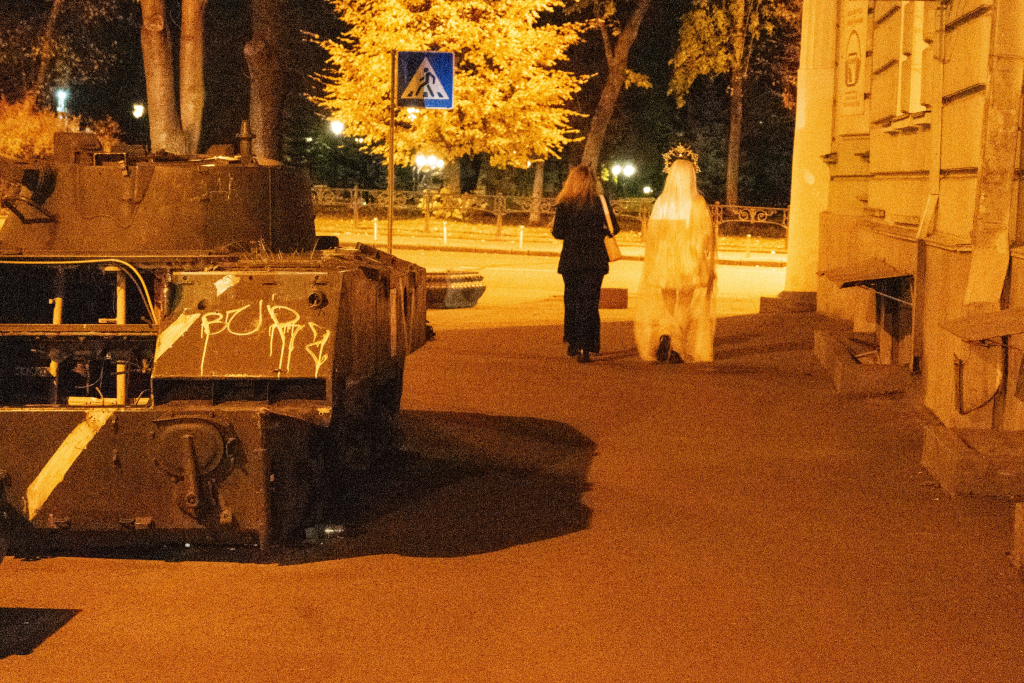 Auf dem Weg zu unserer Unterkunft kommen wir an Leuten mit auffälligem Make-Up vorbei. Ein paar Frauen tragen Katzenohren, andere haben sich die Gesichter gothicmäßig schwarz-weiß geschminkt. Eine Person in Hochzeitskleid und weißem Schleier flaniert an einer Reihe am Straßenrand geparkter Panzer vorbei. Halloween in Kyjiw.