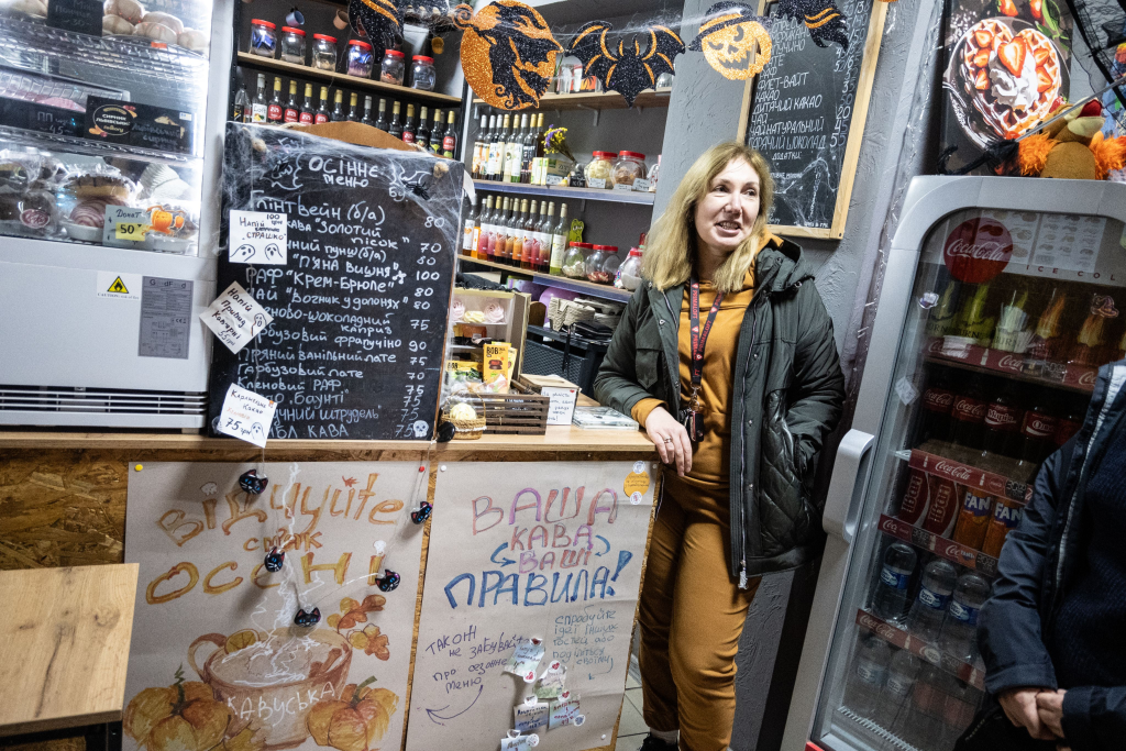 Dort werden wir von Anja in Empfang genommen, die uns bei der Parkplatzsuche hilft und uns dann durch einen schmalen Durchgang führt. Eine Frau in einer stylischen Jacke und mit zwei warm eingepackten Hündchen an der Leine läuft vorüber. Anja führt uns in ein Café, in dem es vor Plastikspinnen und -spinnweben und Halloween-Kürbis-Deko nur so wimmelt. Hier scheinen die Uhren langsamer zu ticken. Das Café gehört ihr, sie hat es von den vorherigen Besitzer*innen, die die Stadt verlassen haben, übernommen. Sie spendiert uns einen Kaffee. Nur dreißig Kilometer vom Kampfgebiet entfernt gibt es hier vegane Milch und Schlagsahne und Halloween-Sondereditionen, wie zum Beispiel den „Schauerchiato“ mit Bananensirup und passenden Toppings. Kaffee für Soldat*innen geht aufs Haus. Besucher*innen können ein Getränk spenden und eine kleine Nachricht hinterlassen, um die Kämpfenden aufzumuntern.