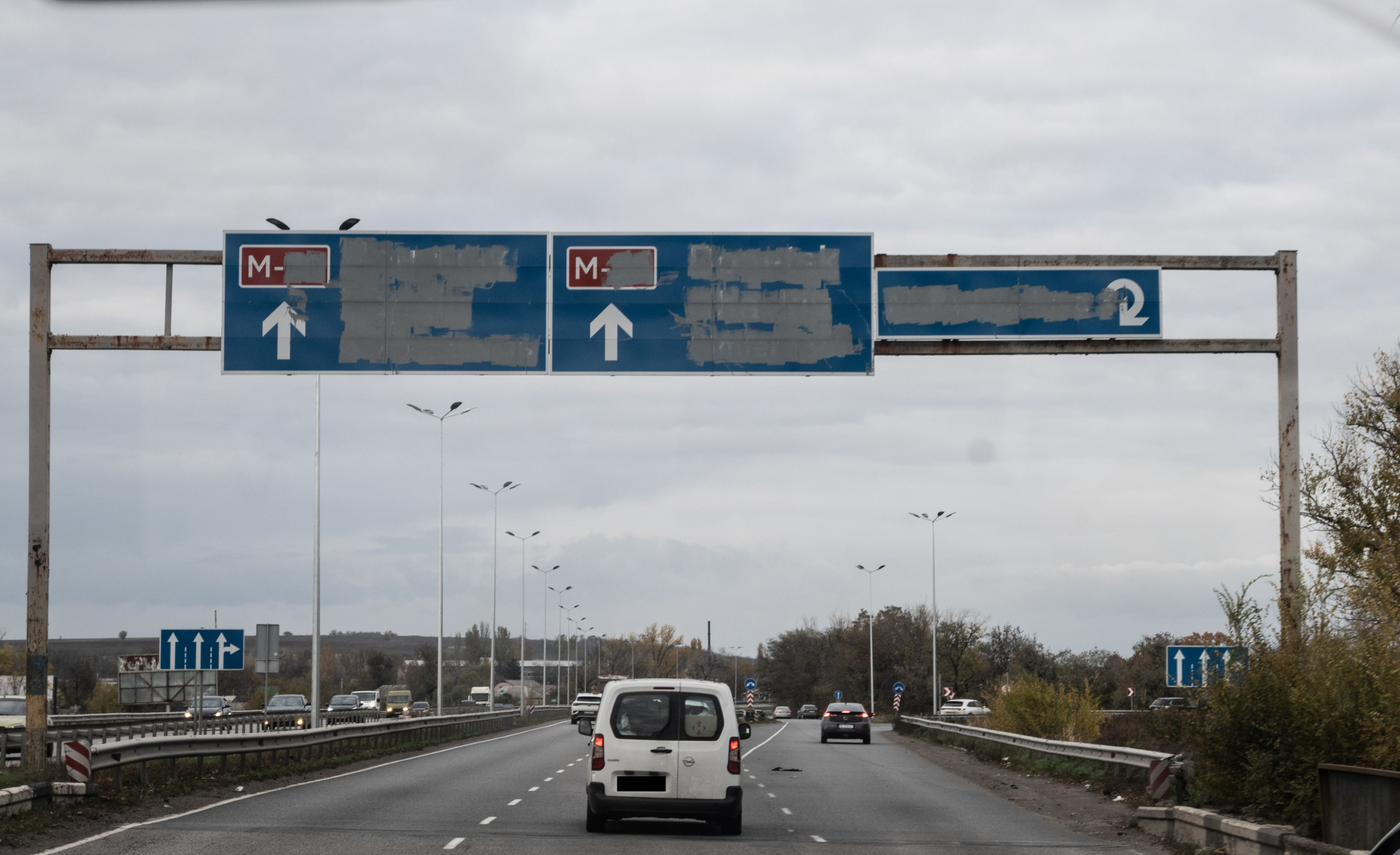 Nach einer kurzen Nacht fahren wir weiter nach Sumy, eine Großstadt mit circa zweihundertfünfzigtausend Einwohner*innen, die nur dreißig Kilometer von der Front entfernt liegt. Wir kommen durch eine Gegend, die in den ersten Monaten nach der Invasion von Russland besetzt gewesen ist. Viele Wegweise sind mit Sprühfarbe unkenntlich gemacht – um die russischen Angreifer*innen zu verwirren, sagt eine Person. Von vielen Reklametafeln am Straßenrand hängen nur noch Plakatfetzen, andere sind mit neuen Werbepostern für diese oder jene Einheit oder für Lebensmittel bestückt.